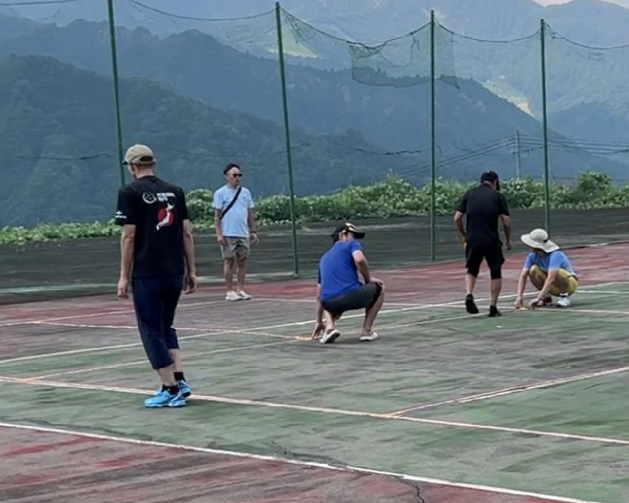 晴天時のみテニスコートで、参加者の方々と一緒にラインテープ設置作業を行いました。作業完了後は、自由なピックル練習の時間となりました。