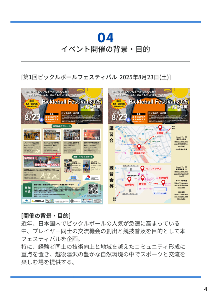 国内外の大会やイベント、メーカーとの連携を通じて「ピックルボールの聖地・越後湯沢」を目指し、地域の新たな魅力と活力を発信しています。